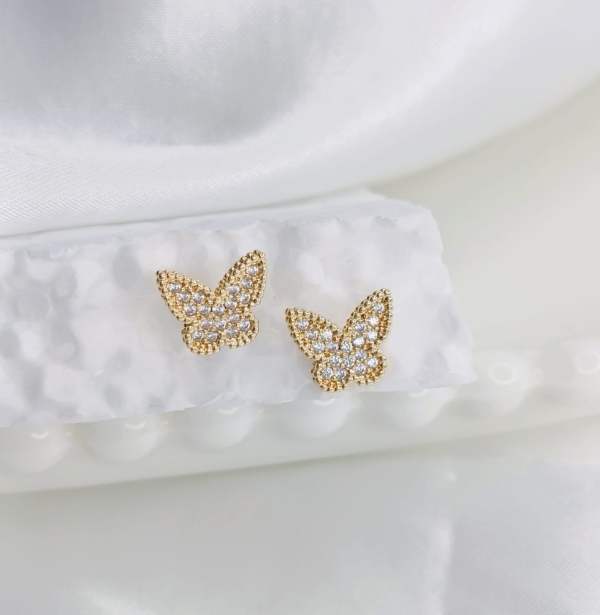 Brinco em formato de borboleta todo gravejado com micro zirconias cor cristal em banho de ouro 18k e antialérgico, garantindo resistência e brilho.