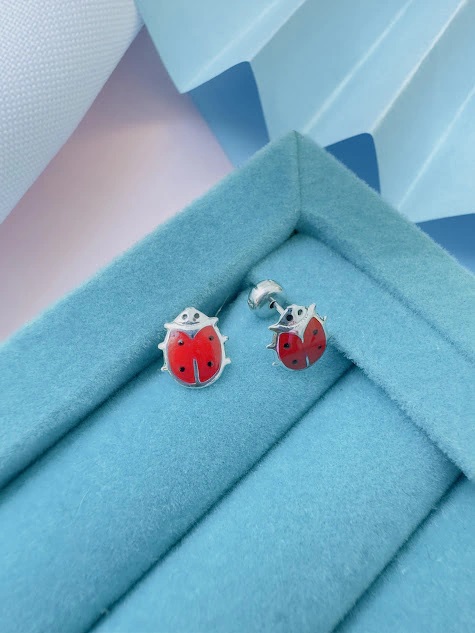 Brinco infantil de joaninha em resina em aço inox, antialérgico, garantindo resistência e brilho.