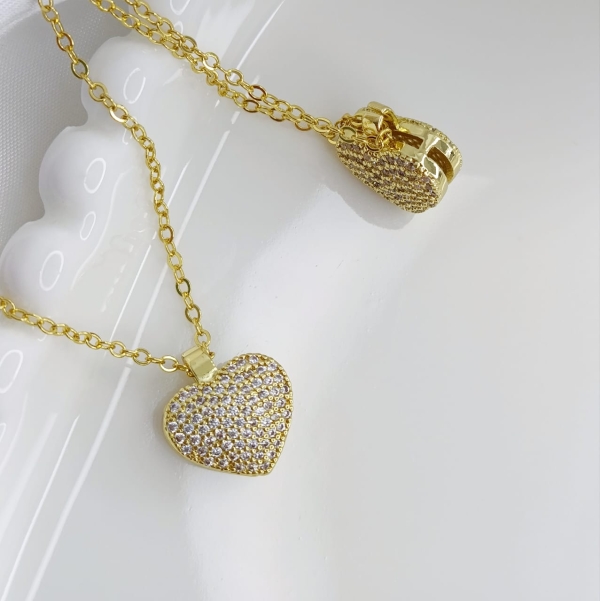 Colar feminina com pingente de coração 14mm cravejado com micro zirconias nos dois lados em banho de ouro 18k, antialérgico, garantindo resistência e brilho.